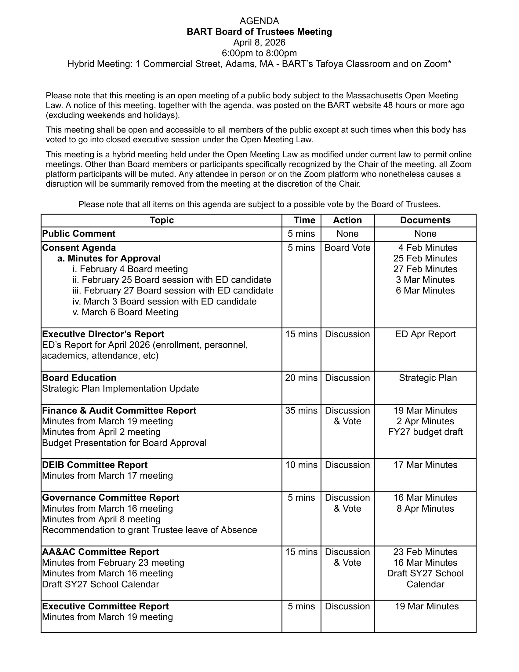 BART Board of Trustees Meeting - Apr. 8th, 2026 When: Wed April 8th 2026 - From 6:00 pm to 8:00 pm Where: Lafoya Classroom & on Zoom 1 Commercial St.Adams MA, 01220 Directions