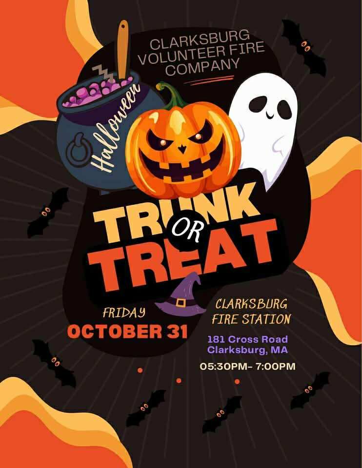 Join the Clarksburg Volunteer Fire Company for a fun-filled evening of Halloween festivities! Dress up in your favorite costume and enjoy safe, family-friendly trick-or-treating from decorated car trunks. There will be treats, spooky decorations, and plenty of Halloween spirit for all ages.