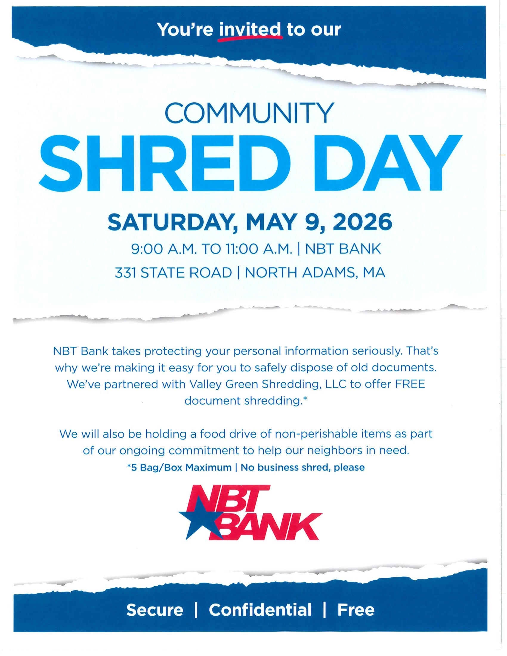 Community Shred Day - May 9th, 2026 When: Sat May 9th 2026 - From 9:00 am to 11:00 am Where: NBT Bank 331 State Rd.North Adams MA, 01247 Directions