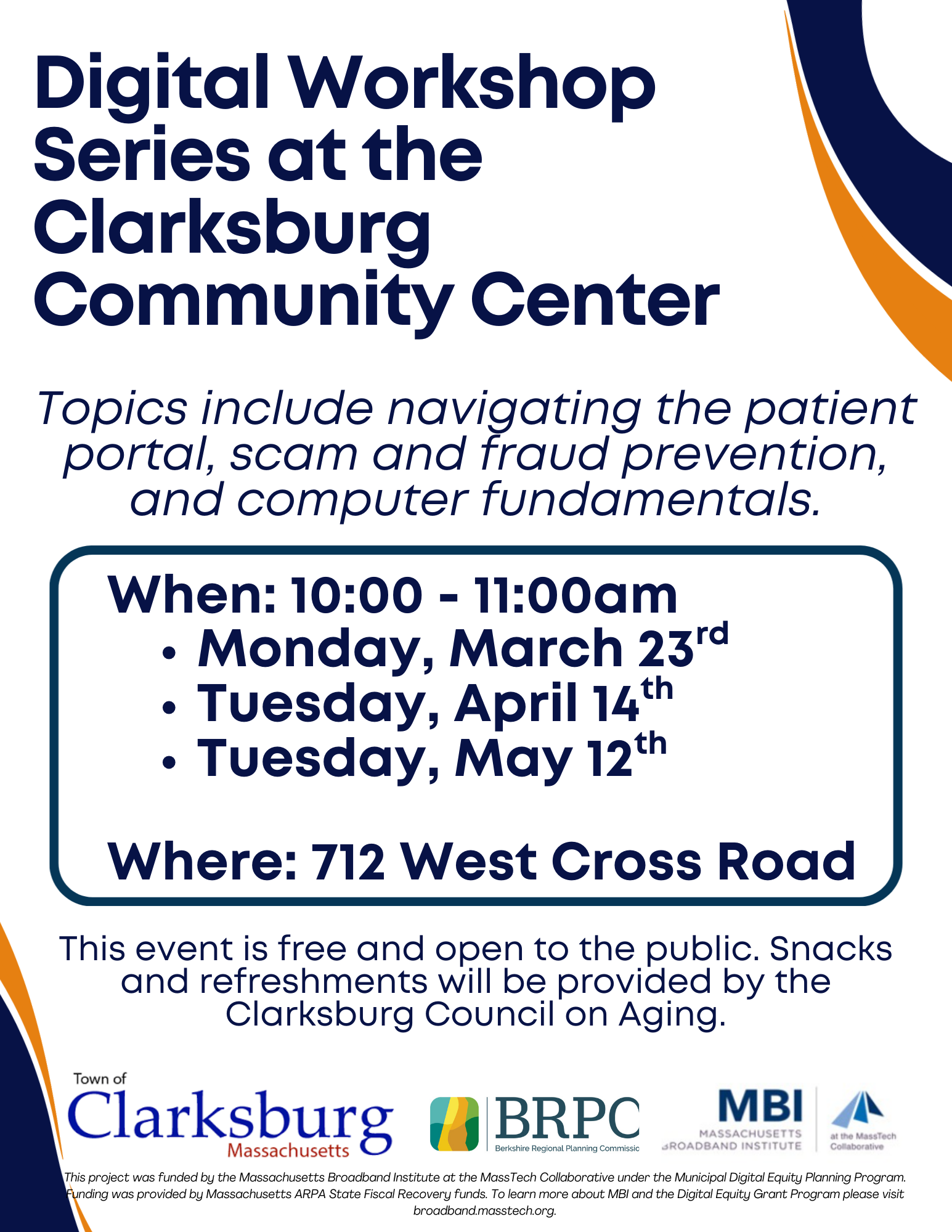 Digital Workshop Series at the Clarksburg Community Center See town calendar for more information on each event.