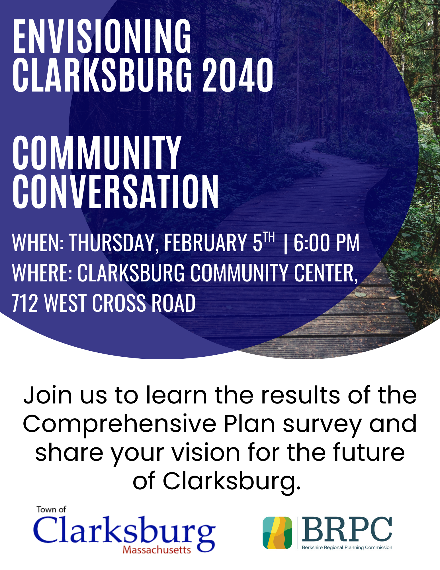 For more information please contact Town Administrator Ron Boucher at townadministrator@clarksburgma.org and/or Berkshire Regional Planning Commission Community Planner Andrew McKeever at amckeever@berkshireplanning.org.