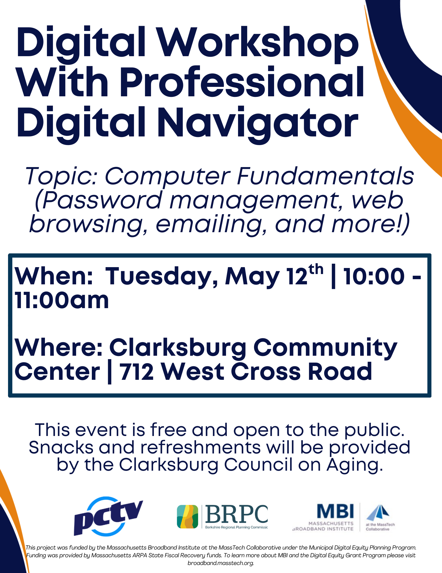 PCTV Digital Workshop with Professional Digital Navigator When: Tue May 12th 2026 - From 10:00 am to 11:00 am Where: Clarksburg Community Center 712 West Cross Rd.Clarksburg MA, 01247 Directions